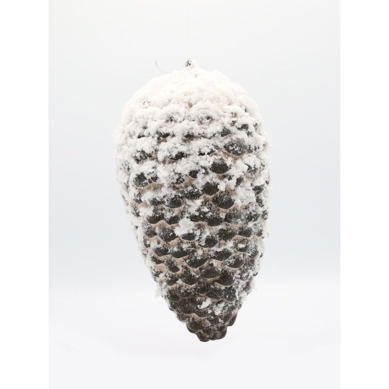This impressive ornament captures the intricate detail and natural charm of a large, mature pinecone, beautifully enhanced for the winter season. Its rich, natural brown base is generously dusted with a realistic, flocked white “snow” finish, making each scale appear as if kissed by a fresh winter snowfall. The contrast between the dark pinecone and the pristine white snow creates a captivating visual texture.