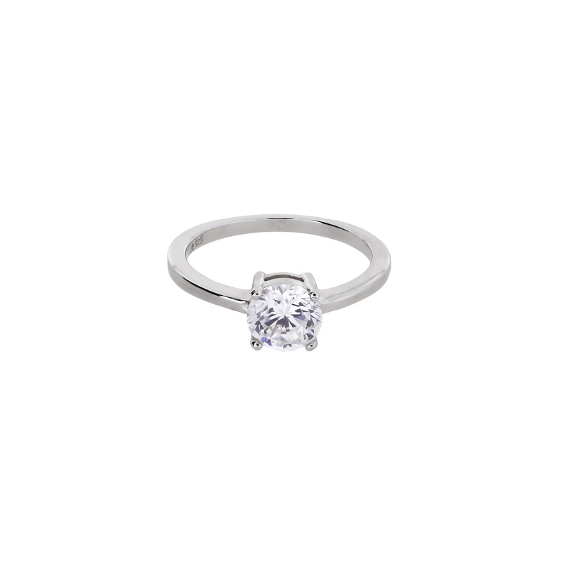 A brilliant-cut cubic zirconia stone is held in a classic 4-claw setting on a simple polished sterling silver band.