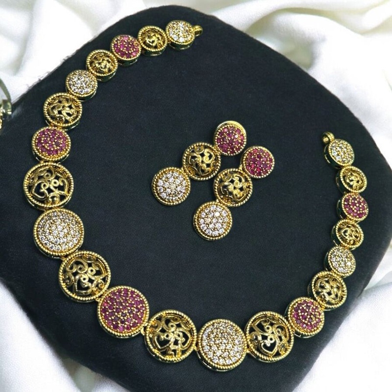 Elevate your ethnic look with the Sona Covering Charming Gold Plated Austrian Stone Necklace Set. Crafted to perfection with radiant Austrian stones, this exquisite necklace adds a regal shine to sarees, lehengas, and festive wear. A timeless accessory for weddings, parties, and traditional occasions. Note: Image may vary slightly from the actual product.