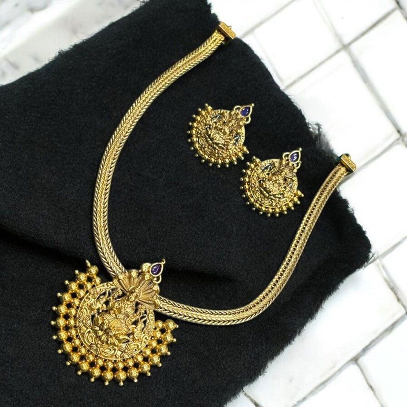 Embrace divine elegance with the Sona Covering Spiritual Aura Gold Plated Pota Stone Temple Necklace Set. Designed with intricate temple motifs and rich Pota stones, this necklace captures the essence of tradition and devotion. The gold plating adds a radiant finish, making it a perfect choice for religious ceremonies, weddings, and festive occasions. Elevate your ethnic attire with this spiritually inspired jewelry piece that reflects timeless heritage and grace. Note: Image may vary slightly from the actual product.