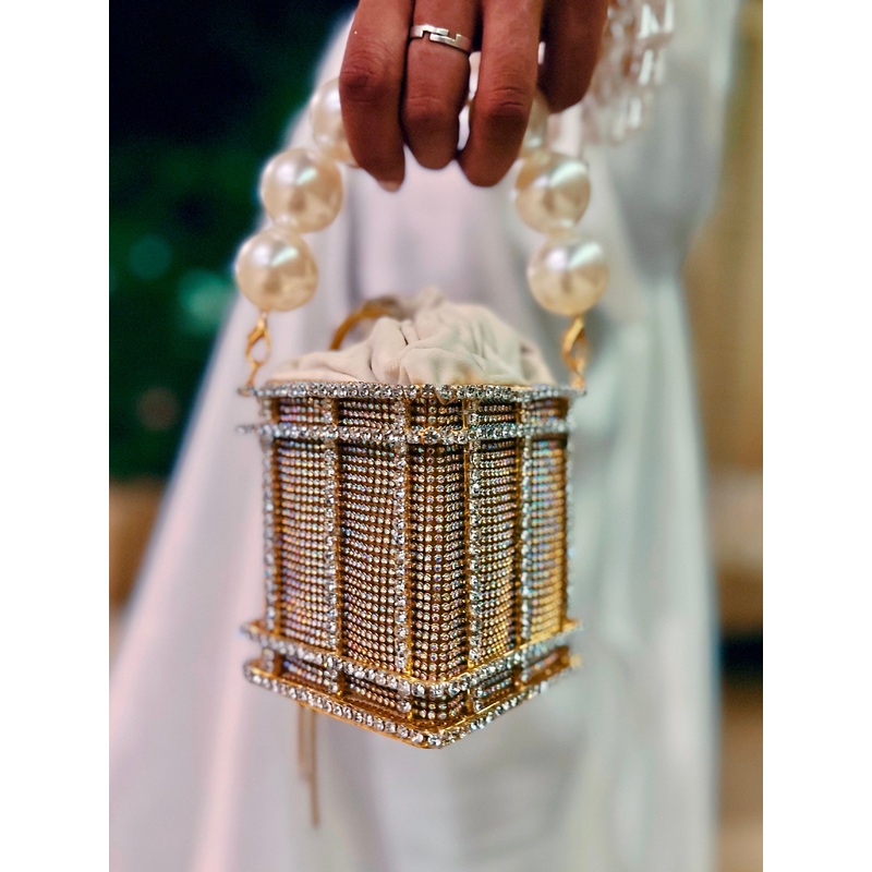 Handcrafted with scintillating Swarovski crystals & pearls this one is a game changer. Finished with a luxe velvet pouch on the inside, you could hold the bag with its classic round handle or go a little extrawith the long chain strap!