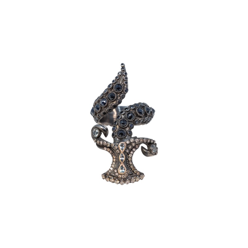 Ring 14k Rose Gold and Grey Sterling Silver with 2.084 CT Champagne Diamonds and Black Sapphire.