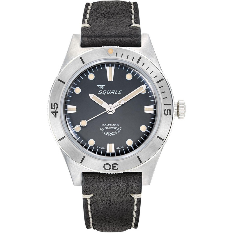 Squale Watch Supersquale Black SUPERSSBK. Since the 1950s, the name Squale and the classic Shark logo, Squale translates to Shark, have come to mean one thing, professional dive watches. Squale introduced their first 1000m dive watch with a unique crystal on flexible mountings that did not use or need a Helium release valve. Squale started to supply the elite corps of a large number of armed forces.