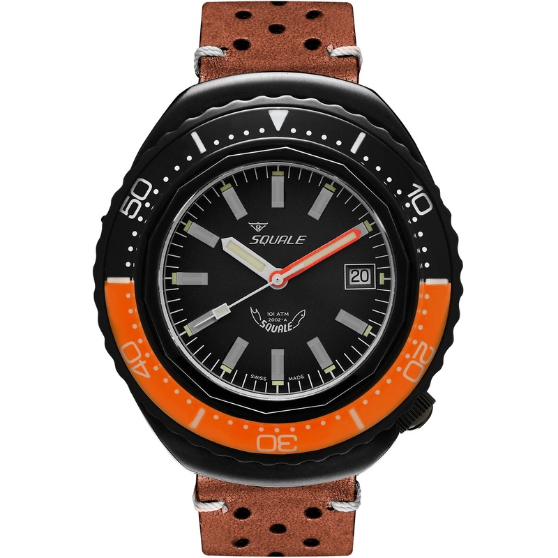 Squale Watch 2002 Orange 2002.PVD.BKO.BK.PTS. Since the 1950s, the name Squale and the classic Shark logo, Squale translates to Shark, have come to mean one thing, professional dive watches. Squale introduced their first 1000m dive watch with a unique crystal on flexible mountings that didn not use or need a Helium release valve. Squale started to supply the elite corps of a large number of armed forces,