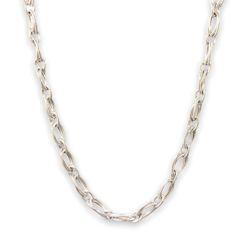 This fancy cable chain has been made in sterling silver with double links in a polished and textured finish. This chain measures 9mm wide, 18 long, has a lobster clasp, and weighs 13.35dwt