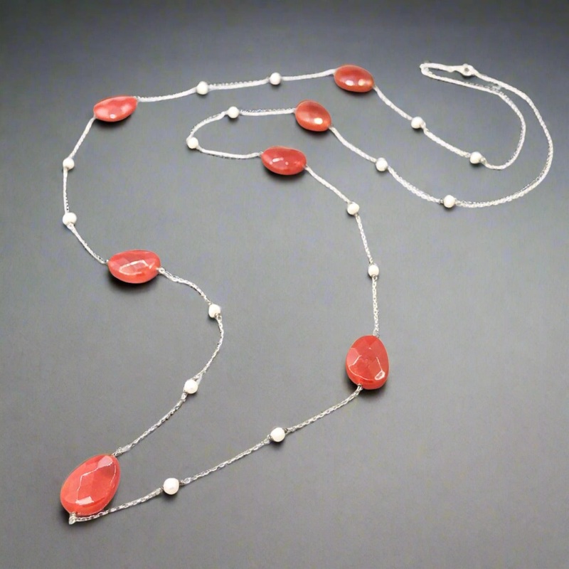 This necklace has been made in sterling silver and holds stations of faceted carnelian and fresh water pearls. There are seven 15.6x12x6mm carnelian beads and sixteen 3.5-4mm fresh water pearls that are spaced at 1 intervals with the pattern of 2 FWP 1 car