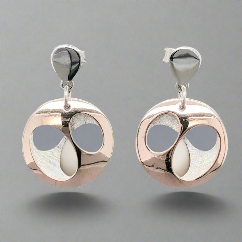 Crafted from luxurious sterling silver and adorned with delicate rose gold accents, these Frederic Duclos earrings exude sophistication and elegance. Each earring boasts an intricately textured 18.3mm diameter domed disc, embellished with oval-shaped piercings that reveal a polished rose gold-plated disc, adding depth and dimension to the design. Measuring 27.8mm in height and 18.3mm in width, these earrings secure with friction backs and weigh a dainty 2.4dwt. Elevate your style with these exquisite earrings that combine artistry and impeccable craftsmanship.