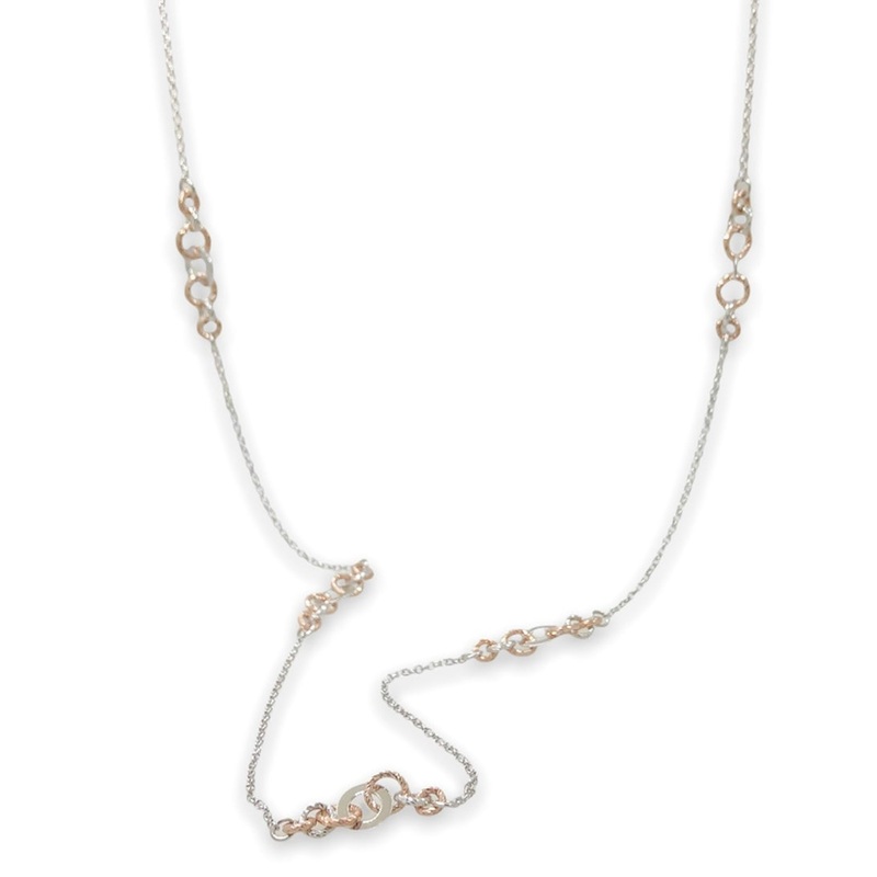 This Frederic Duclos necklace has been made in sterling silver with textured rose gold plated links. These textured links range in size from 5.6-7.9mm in diameter alternating from rose gold to silver, with a 10mm flat polished silver disc in their centers. There are five stations of these links, connected by 3 sections of cable chain. This necklace measures 32 long, has a lobster clasp, and weighs 7.95dwt