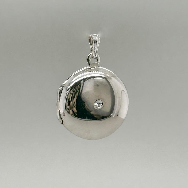 This sterling silver locket, with a single round diamond gently set in the center, measures 20.64mm in diameter and is hinged to open, perfect for holding a cherished photo. Experience the timeless elegance and sophistication of this exclusive piece.