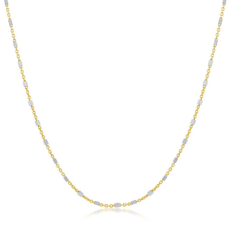 This exquisite Sterling Silver Two-Tone Diamond Cut square Beaded Chain measures 18 inches, a luxurious length for accentuating your neckline in the most tasteful and artful way. Its two-tone finish is crafted and cut with precision, carefully creating a diamond-like sparkle that tantalizes the senses and adds an aura of sophistication to any ensemble.
