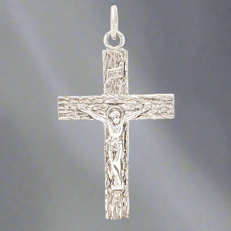 This crucifix pendant has been made in sterling silver and measures 35.9mm tall x 21.8mm wide x 3.4mm thick with a jump ring bale. This crucifixs cross has a wood grain texture to it with the body of Jesus raised on it, and weighs 1.50dwt