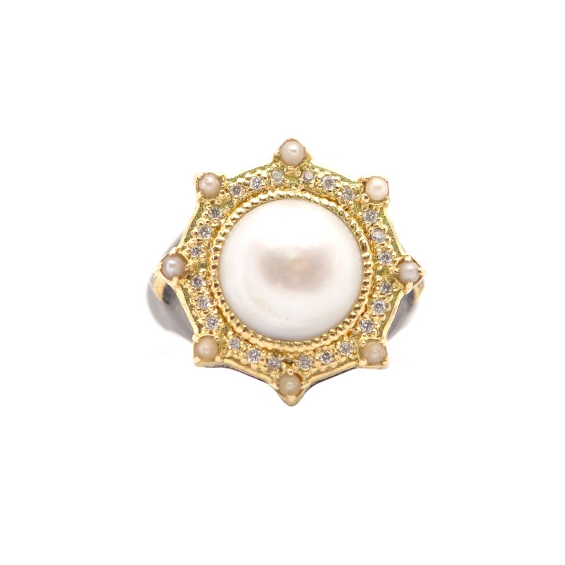18K Yellow Gold and Blackened Sterling Silver Starburst Statement Ring with White Freshwater, Cultured Pearls and White Diamonds. (0.14 TCW)
