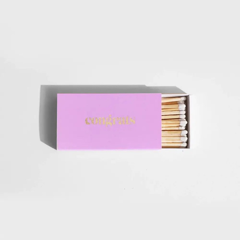 Say it with stylish XL matches featuring cheeky greetings foil pressed in gold on brightly colored matchboxes, perfect for special occasions or just because.