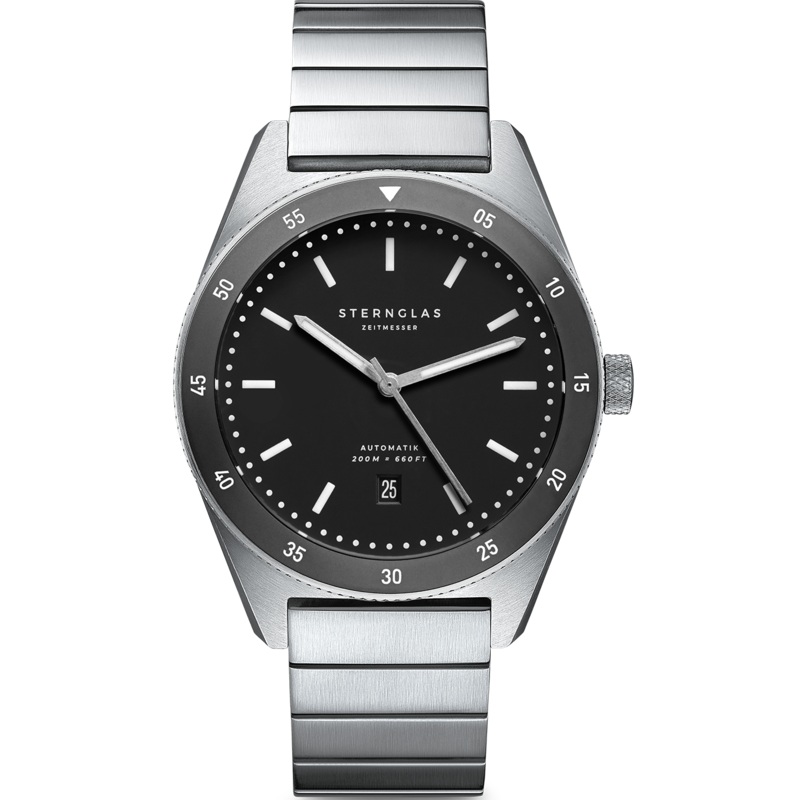 Sternglas Watch Marus Automatic Black Steel S02-MA03-ME03. For a long time STERNGLAS watches have been asked for a swimming and diving watch. Several prototypes later Sternglas can now present their first timepiece in this distinctive style. In order to achieve a particular high water resistance the case back and the crown are screwed. The watch case is manufactured using high quality steel and equipped with Sapphire Glass. As a visual highlight you find on the reverse an engraving of an abstracted seabed.