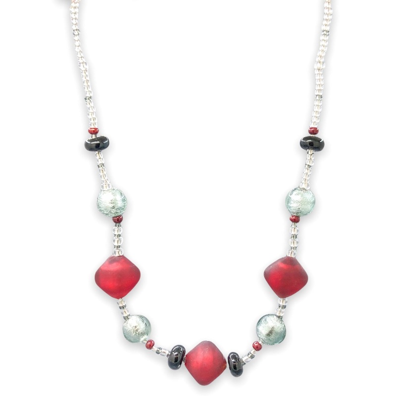 This necklace has been made with stainless steel findings and with Murano glass beads. This necklace has been strung with clear, grey, and red seed beads accenting its man-made Murano glass focal beads. The focal beads are four 9.5×5.2mm black beads, four 12mm metallic blue beads, and three square 18×11.8mm matte red beads. This necklace has a 2 extender, allowing it to be worn from 17-19, has a lobster clasp, and weighs 19.35dwt.