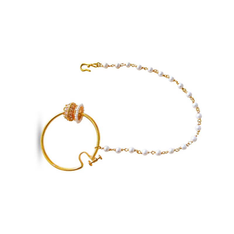 The Sukoon Nose Ring is from our Jannah Collection.Wear the Sukoon Nose Ringto add an element of royalty and grace to your entire look. Strung with fine pearls & in kundan setting the 24k gold plated nose ring is a must have in every trousseau!Discover exq