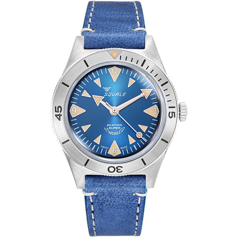 A bold dive watch with a vibrant twist, the Squale SUPERSSABL.PBL combines iconic big arrow hands and Swiss automatic precision with a rich blue dial and refined leather strap. This watch delivers timeless vintage style fused with modern performance.
