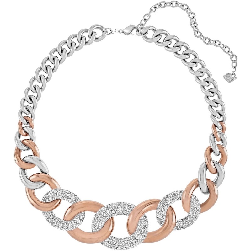 The Swarovski Bound Stainless Steel Rose Gold Chunky Chain Link Necklace for Women Model# 5089276 is an on-trend statement jewelry that has chunky chain silhouette along with a mix of metal plating. The necklace has chunky links with rose gold and palladium plating. Three of the chain links feature clear crystal pave embellishments. These chunky chain links are held by a stainless steel palladium-plated gourmet chain that has an adjustable chain closure with a lobster clasp. The closure chain features the Swarovski Swan logo charm with crystal pave embellishments. This necklace measures 40cm (15 3/4″) in length. The necklace is perfect to go along a halter neck dress to make your dcolletage look more attractive.