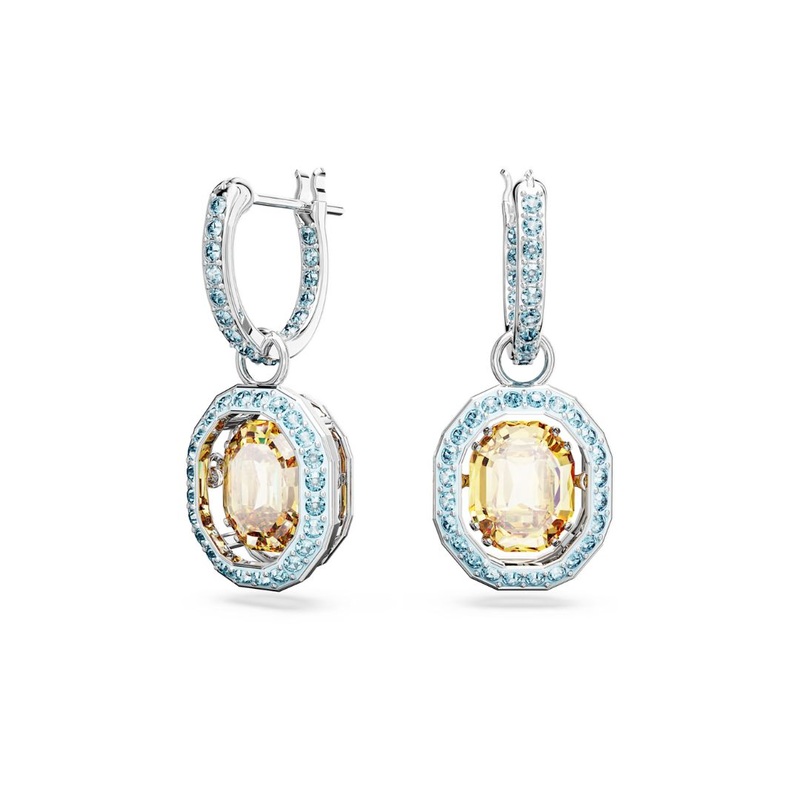 Available at Swarovski Chroma earrings feature large yellow crystals surrounded by small light blue crystals. The yellow centre stone is beautifully faceted and can move freely within the frame. The two-tone pendants of the earrings are attached to rings set with blue crystals. The jewellery is made of Swarovski jewellery metal, which has been rhodium-plated to a beautifully pale colour. Combine with other Swarovski-with other pieces of jewellery to create a personalised ensemble.