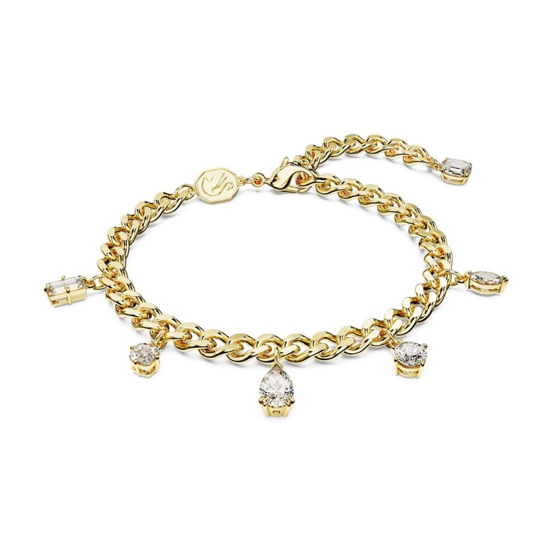 Yellow Gold-Tone Plated Swarovski Dextera Bracelet with White CrystalsThe elegant gold-colored Swarovski Dextera bracelet has five crystals in different cuts. The sparkling white crystals form an ensemble that is both controlled and playful. The striking D