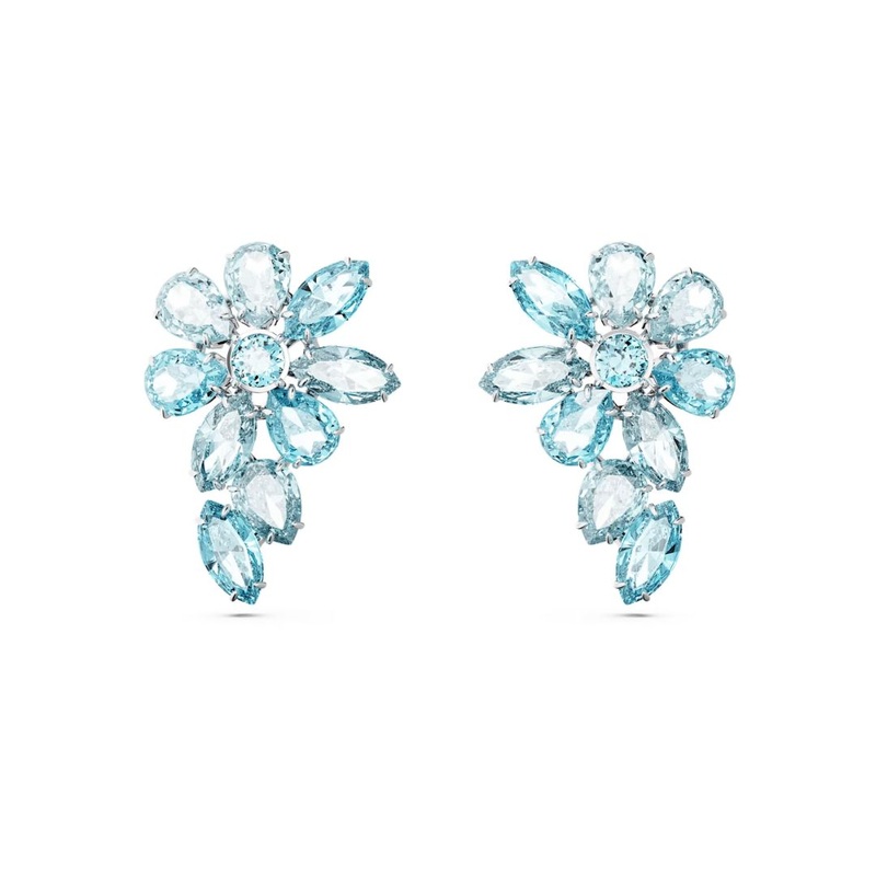 The showy Swarovski Gema earrings have blue crystals in the shape of a flower. Beautifully covering the earlobe and slightly hanging, the earring is suitable for both everyday life and parties. The size of the earring is 3.3 x 2.3 cm and its material is Swarovski jewelry metal, which is rhodium-plated to a beautiful light. Combine with other Swarovski jewelry and create a personal ensemble.