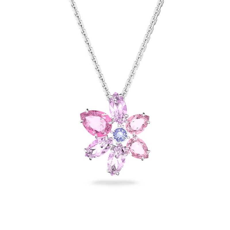 Complete your look with this beautiful floral Swarovski Gema pendant. The pink crystals in the pendant are cut into different shapes and arranged like petals. In the center is a small blue crystal. The chain that comes with the pendant is made of Swarovski jewelry metal and is rhodium-plated in a beautiful light color. The chain length is adjustable. Combine with other Swarovski jewelry and create a your own personal look.