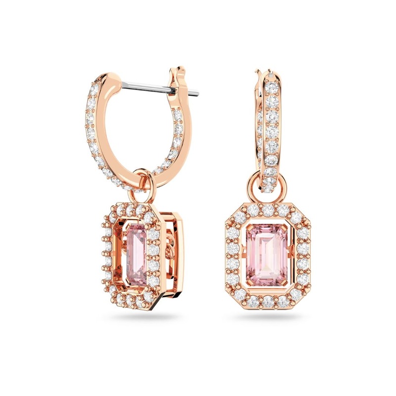 Finish off your style with these beautiful Swarovski Millenia earrings. The centrepiece features a larger pink crystal set within an angular frame. The larger crystal, framed by smaller clear crystals, beautifully reflects light. The earrings have a ring clasp and the hanging parts are detachable, so they can also be worn as ring earrings alone. The jewellery is plated in a beautiful rose gold tone. Combine with other Swarovski jewellery to create a personalised ensemble. Millenia is part of the Swarovski Collection I.
