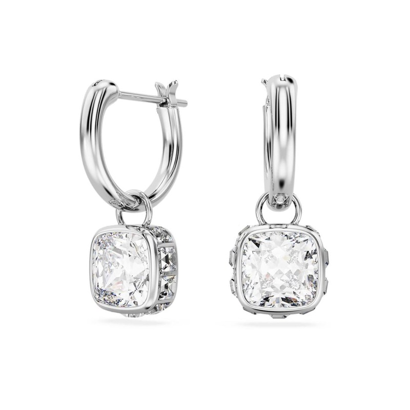 The classic Swarovski Stilla earrings feature rings with sparkling pendants. The pendant has an angular crystal, which is bordered by smaller crystals. The pendant is detachable, so the earrings can also be worn as hoop earrings. The material of the earrings is Swarovski jewelry metal, which is rhodium-plated to a beautiful light color. The size of the earring is 2 x 0.8 cm. Combine with other Swarovski jewelry and create a personal ensemble.