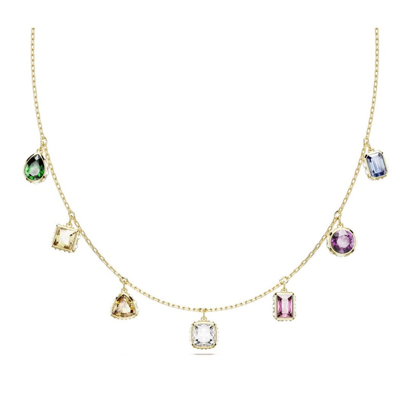 The stylish Swarovski necklace has seven crystal pendants with different cuts and different colors. Small square crystals in the frame of the crystal pendants guarantee maximum sparkle. The material of the necklace is Swarovski jewelry metal, which is gold-tone plated. The length of the chain of the necklace can be adjusted between 38 and 45 cm.Combine with other Swarovski jewelry and create a personal ensemble.