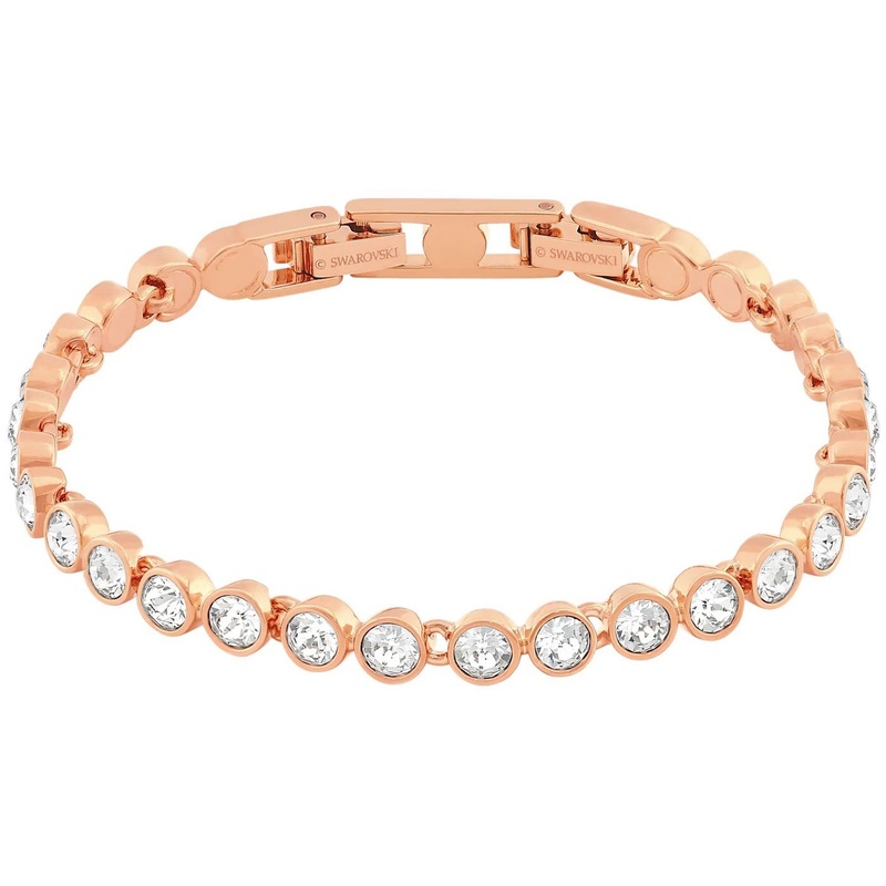 Swarovskis bestselling Tennis bracelet now comes in feminine and on-trend rose gold plating! This delicate strand of bezel-set clear crystals offers an elegant and minimalistic look ideal for everyday wear. It has a secure foldover clasp closure and comes with an extender.