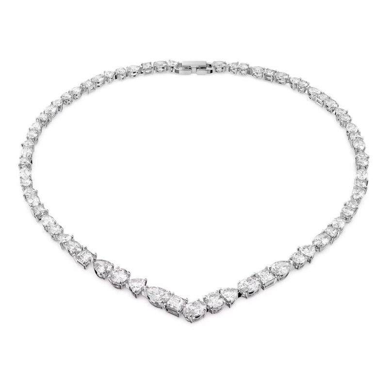 Swarovski The Tennis Deluxe necklace combines crystals cut into different shapes in a playful but beautifully harmonious way. Each piece of jewellery is attached to the other to form a beaded necklace of crystals. The rings between the pieces of jewellery allow the jewellery to land beautifully on the wearer.