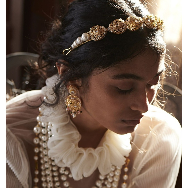 The Taaj hairband is a part of the Jannah Collection.The Taaj hairband is intricately designed with fine pearls and gold finish, giving it the most ethereal and elegant look, all set to make you shine with anything you style it.Discover exquisite jewelry p