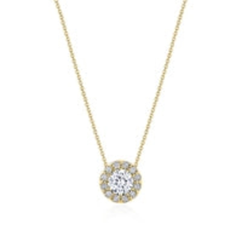 Ladies diamond necklace in 14 karat yellow gold. Set in the pendant are 12 round brilliant cut diamonds with a total weight of 0.36 carat, on a 16-17 inch adjustable chain. *Center stone not included