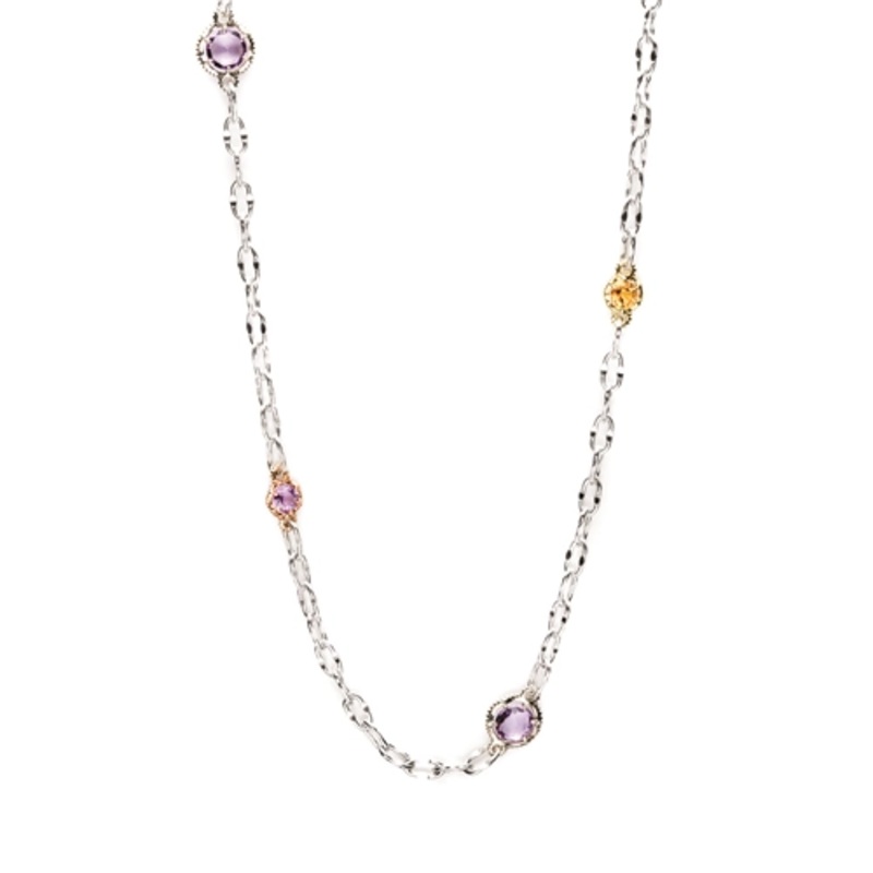 Ladies Tacori necklace. Sterling silver and 18 karat yellow gold. 38″ Multi-colored medley necklace with amethyst, prasiolite, lemon quartz, cognac and smokey quartz.