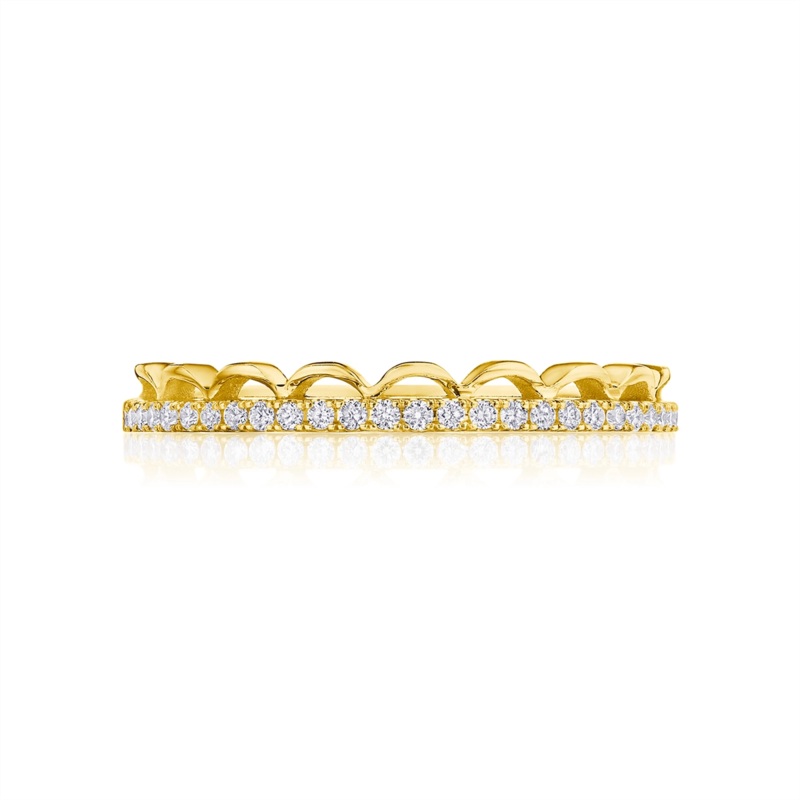 Ladies Tacori diamond band in 18 karat yellow gold. Set in the band are 29 round brilliant cut diamonds with a total weight of 0.13 carat. The diamonds average VS in clarity and FG in color.