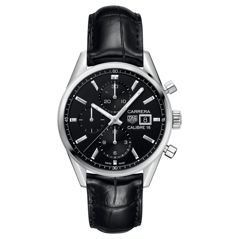 TAG Heuer Carrera Automatic Chronograph Stainless Steel Black Dial Black Leather Strap Date Mens Watch Model# CBK2110.FC6266 / CBK2110FC6266 features a 41 mm stainless steel case with a stunning black textured dial with sub-dials at the 6, 9, and 12 oclock positions and a date window at the 3 o’clock position. The silver-toned indexes and hands are coated with Super-LumiNova for enhanced readability. The gorgeous black alligator leather strap has a folding clasp with push-button release. The see through caseback reveals the chronographs Calibre 16 Swiss automatic movement with a 42 hour power reserve and is water resistant to 100 meters/330 feet.