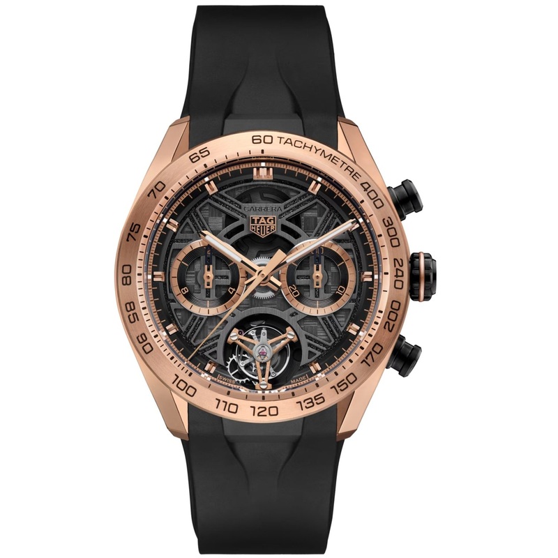 Embrace the fusion of luxury and performance with the TAG Heuer Carrera Chronograph Tourbillon, a striking embodiment of motorsport passion. With its prestigious blend of 18K 5N solid rose gold and Grade 2 titanium, this timepiece redefines the essence of high-end sports watches.