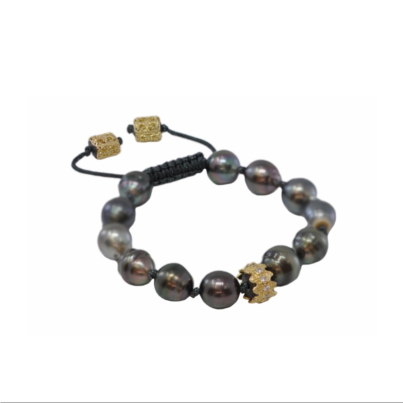 18k Yellow Gold and Sterling Silver bracelet with 10mm Tahitian Pearls and 1 carved crivelli station featuring white diamonds.