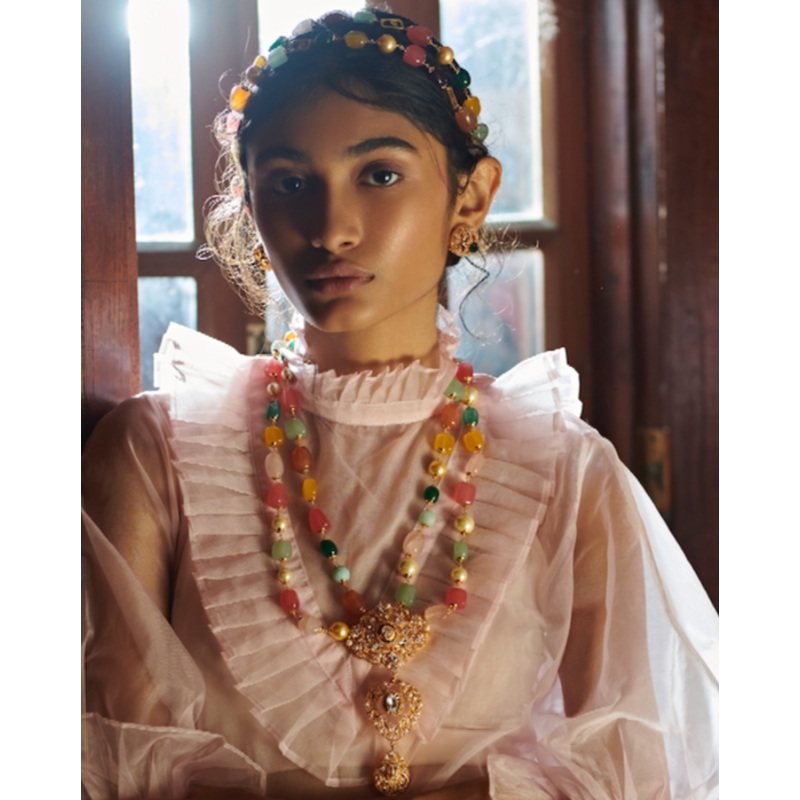 The Tamanna Necklace is a part of the Jannah Collection.Crafted with a blend of heritage and modernity, this necklace makes the perfect piece to wearwith all your outfits. The contrast of semi-precious stones with the ethnically crafted gold pendant create