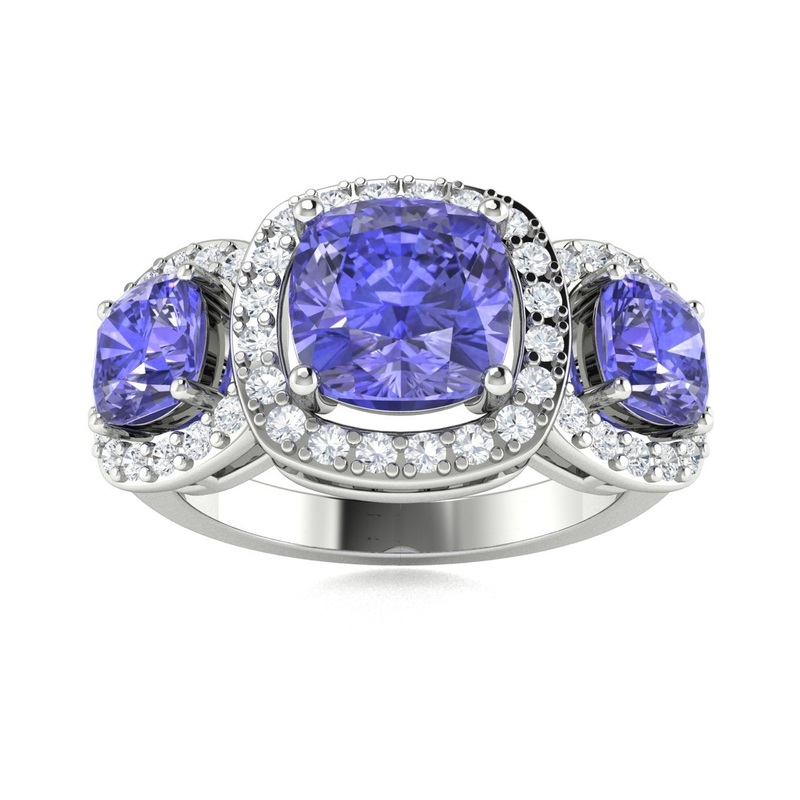3-stone Tanzanite Ring set in 14kt gold. Each stone is perfectly matched to ensure color consistency and total carat weight is 0.88cts. Round Brilliant cut diamonds total 0.44cts and are perfectly set to center the tanzanite. Ring weights 5.14 grams