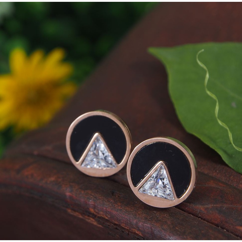 Tarohi Jewels Stainless Steel Rosegold Plated Black Disc Inlaid Triangle Shaped CZ stud Earring-STNER 2906