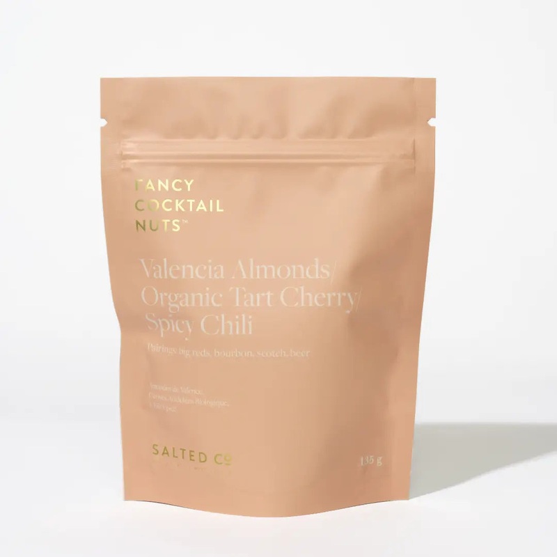 VALENCIAALMONDS, TART CHERRY, CHILI, SEA SALT Best served with big reds, bourbon, scotch, beer. A generous dusting of red chili on tart cherries with Valencia almonds create a subtle heat that builds, priming your taste buds to appreciate the fresh plum in your favourite light red or the smoky bite of bourbon and scotch.