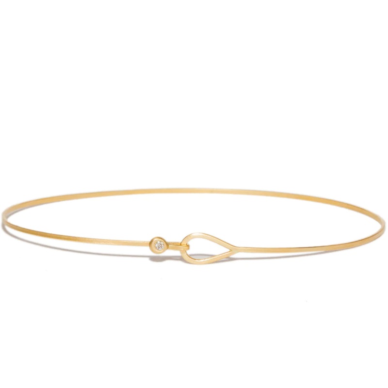 Graceful and elegant, this bracelet features slim yet sturdy gold wire hand shaped and hammered into an oh so simple bangle. The hook closure loops through a teardrop opening and is flush-set with a tiny, brilliant.0125ct CanadaMarkdiamond. This is one pie