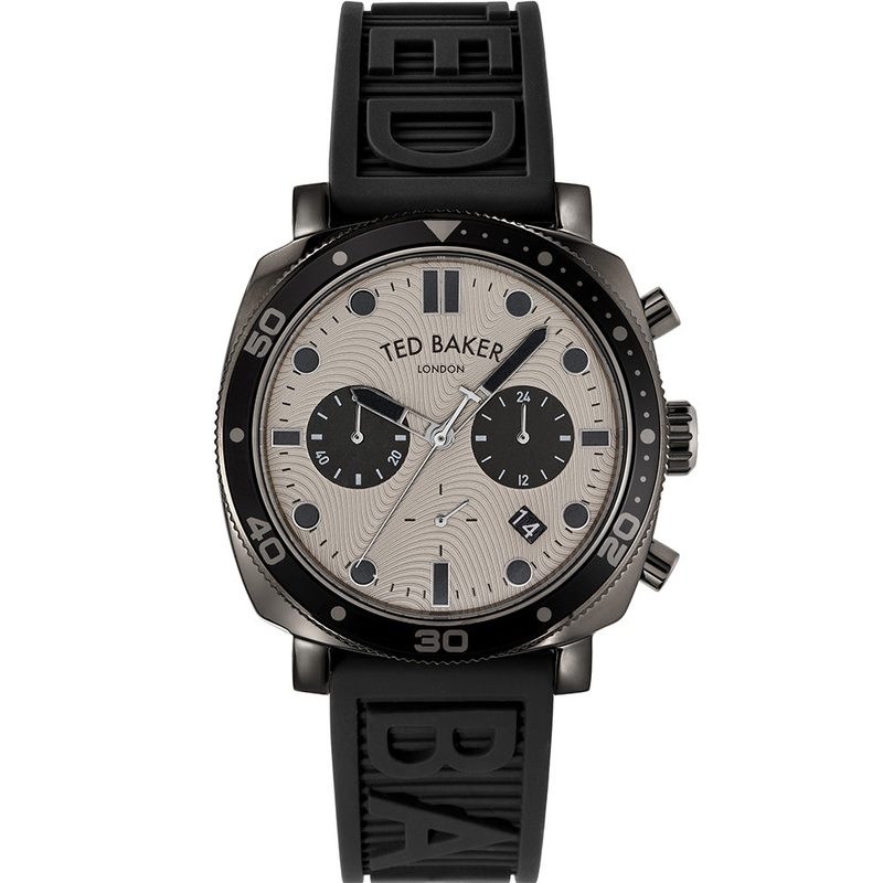 Step out in style with this Ted Baker BKPCNF204 Caine Black Silicone Mens Watch. The band is crafted in soft silicone that is comfortable on the wrist and embellished with the Ted Baker logo. A unique watch face features a black bezel and cream face that is complete with a unique wave pattern. Complete with a date window, two dials and legible dark coloured markers and hands, this watch has everything you could need and more. A timepiece that is completely its own, go out each day in confidence with this striking watch.