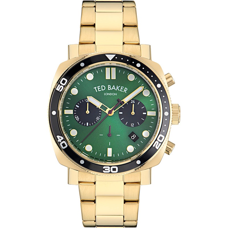 The Ted Baker BKPCNF307 Caine Chronograph is a bold and sophisticated timepiece that combines functionality with luxury. Its gold stainless steel case and bracelet offer a striking appearance, complemented by a black bezel and a rich green dial. The 44mm case size provides a substantial and commanding presence on the wrist. Featuring a precise chronograph function and protected by a durable mineral crystal, this watch is also 50 meters water resistant, blending style with practicality for any occasion.- Chronograph- 44mm Case Size – Stainless Steel Case and Bracelet – Mineral Crystal – 50 Meters Water Resistant