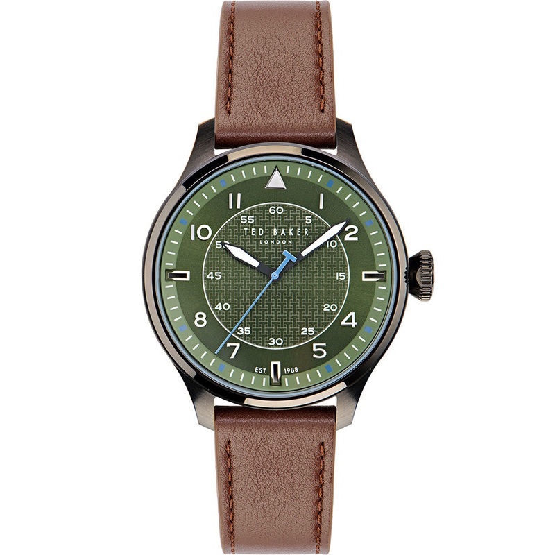 The Ted Baker BKPFMS401 Fulmaar combines bold design with practical features. Its gunmetal grey case frames a distinctive green dial, creating a striking contrast that captures attention. The 44mm case size offers a robust presence, while the eco-friendly genuine leather strap in brown adds a touch of classic elegance. With 50 meters of water resistance, this watch seamlessly blends style with functionality, making it a versatile choice for various occasions.- 44mm Case Size – Gunmetal Case – Eco Genuine Leather Strap- 50 Meters Water Resistant