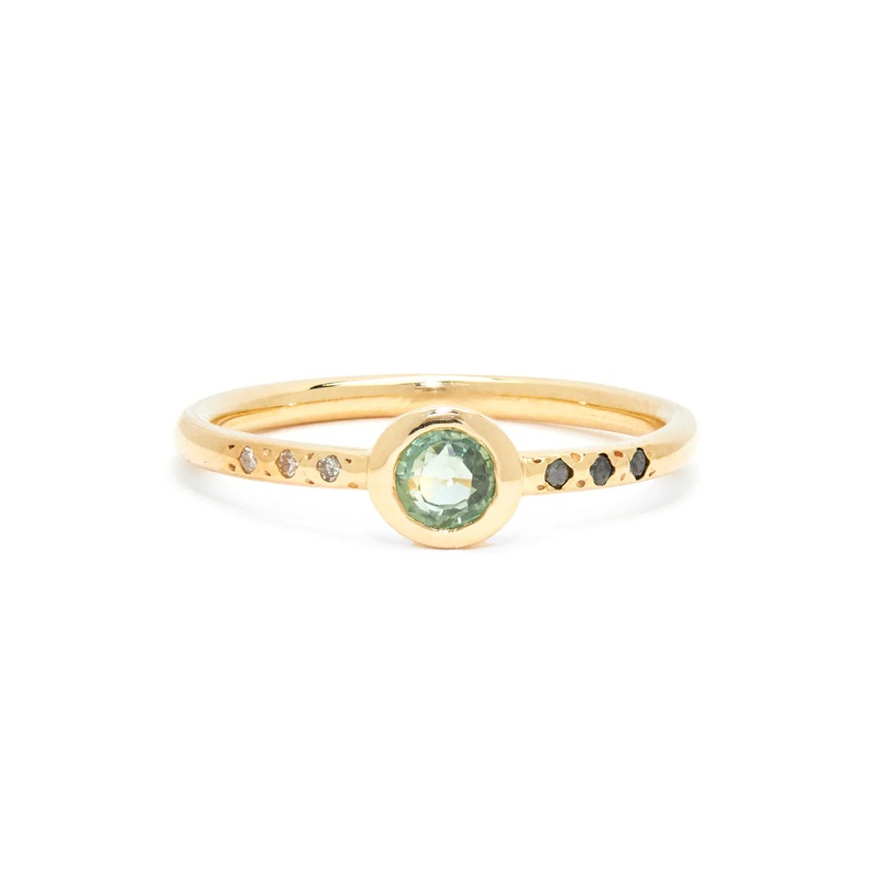 Cast from solid yellowgold set with agreensapphire center, accented by a pave band of white and black diamonds.