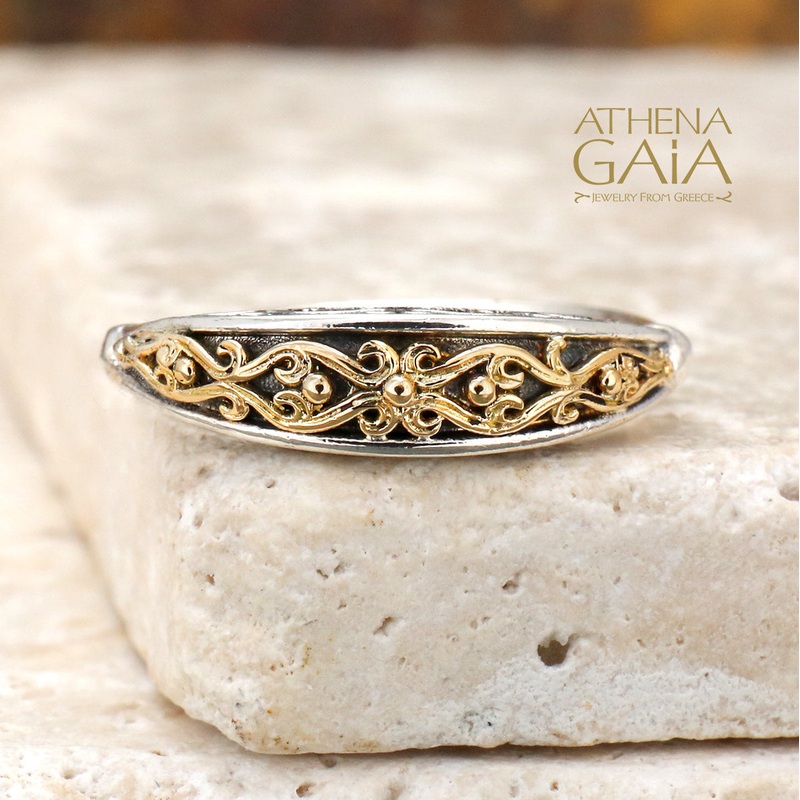This listing is for the thinner version of this ring, as shown on the model.Also Shown(sold separately)Zephyr Band RingGold Vine Band RingGold Dot Stackable RingKassandra Flower RingNotus Band Ring