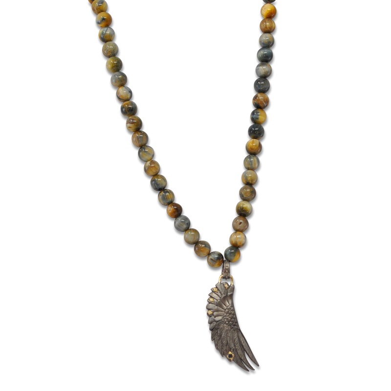 18k yellow gold and blackened sterling 32″ beaded necklace with silver wing pendant with champagne diamonds, crivellis and a black sapphire station. Toggle closure.