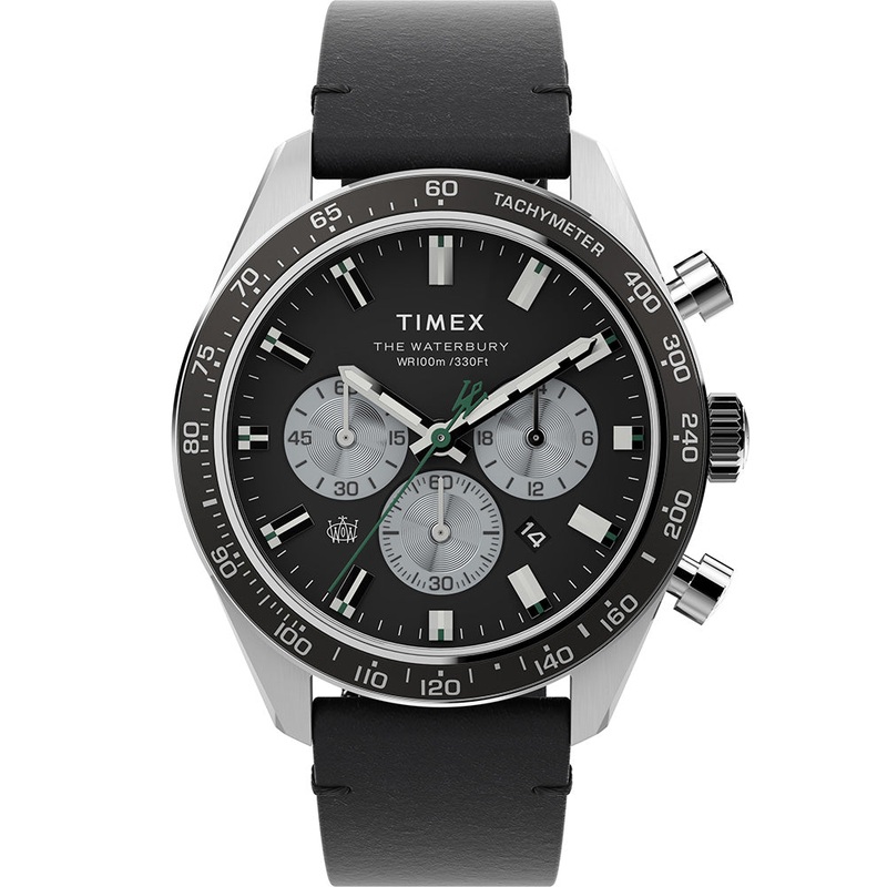 Timex TW2V42500 Waterbury Black Leather Mens Watch Quartz Chrono 41mm Case Size Stainless Steel Case Stainless Steel Bracelet 100 Metres Water Resistant Quartz Analog Movement